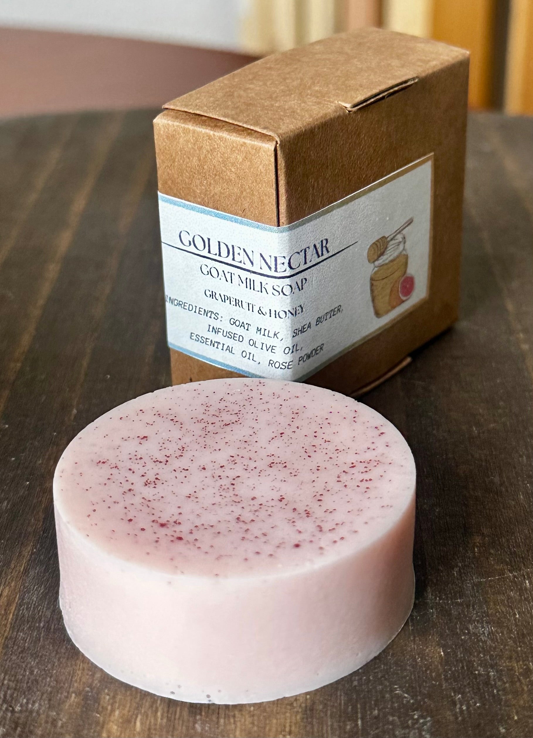 Goat milk, Shea Butter, Olive Oil, Honey, Essential oil, Rose powder